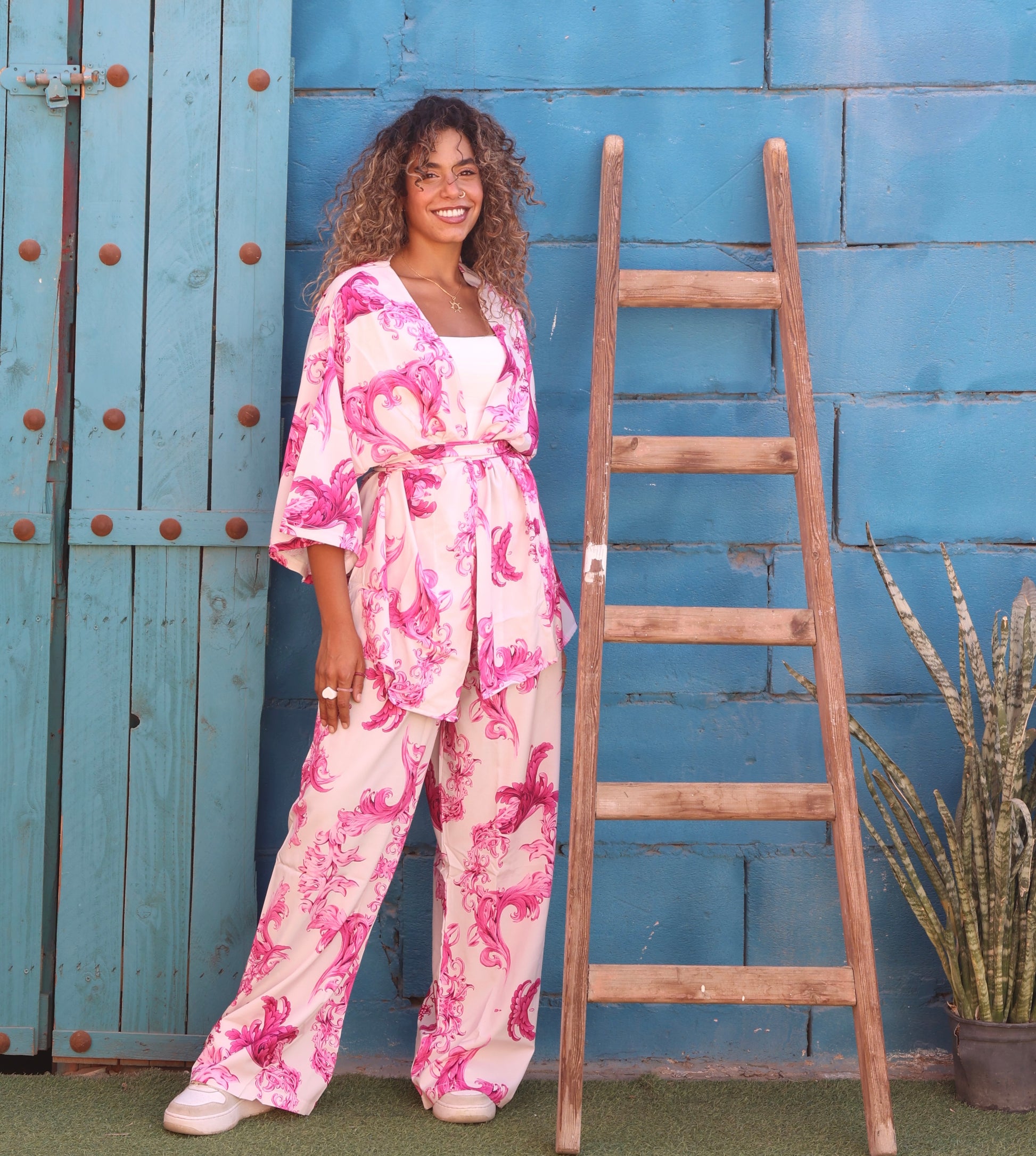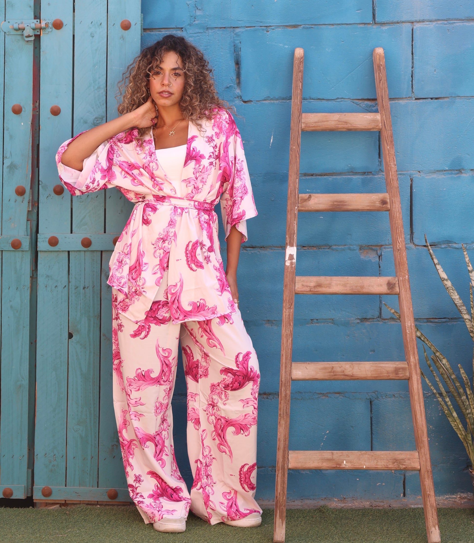 Step into summer with effortless charm in our Purple Haze Set – a bold yet breezy co-ord that turns heads with every step. This 3-piece ensemble includes a flowy kimono-style top, wide-leg pants, and a matching belt to cinch the waist and flatter your shape. Crafted from lightweight fabric with a dreamy lilac and fuchsia baroque-inspired print, this set is perfect for sun-drenched days and sunset strolls. Whether styled together or worn as separates, it’s your go-to for laid-back glam. • 3-piece set: Kimono, Pants, and Belt • Lightweight, breathable fabric – ideal for summer • Color: White base with purple/pink swirl design • Fit: Model is wearing size Small • Style tip: Pair with sandals or sneakers and layer with gold accessories for a standout summer look.